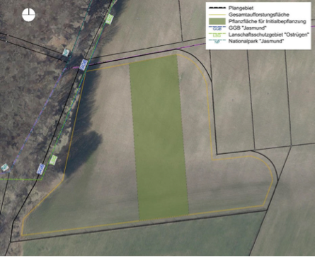 Die Landschaft auf Rügen weist eine besondere Attraktivität für naturgebundene Erholung auf. Daraus erwachsen erhöhte Ansprüche an die Vorsorge für den Erhalt und die Entwicklung dieses Wertes. Ein natürliches Landschaftsbild und eine Erhöhung der Strukturvielfalt wurde durch eine Entwicklung von Wald im Rahmen einer Initialpflanzung durch standortheimische Baumarten mit ergänzender Aufforstung und Anlage eines Waldrandes verwirklicht. Die 22.153 m² große Fläche wurde zuvor landwirtschaftlich genutzt. Durch die Nutzung waren die Böden entwässert und in den unteren Schichten verdichtet.